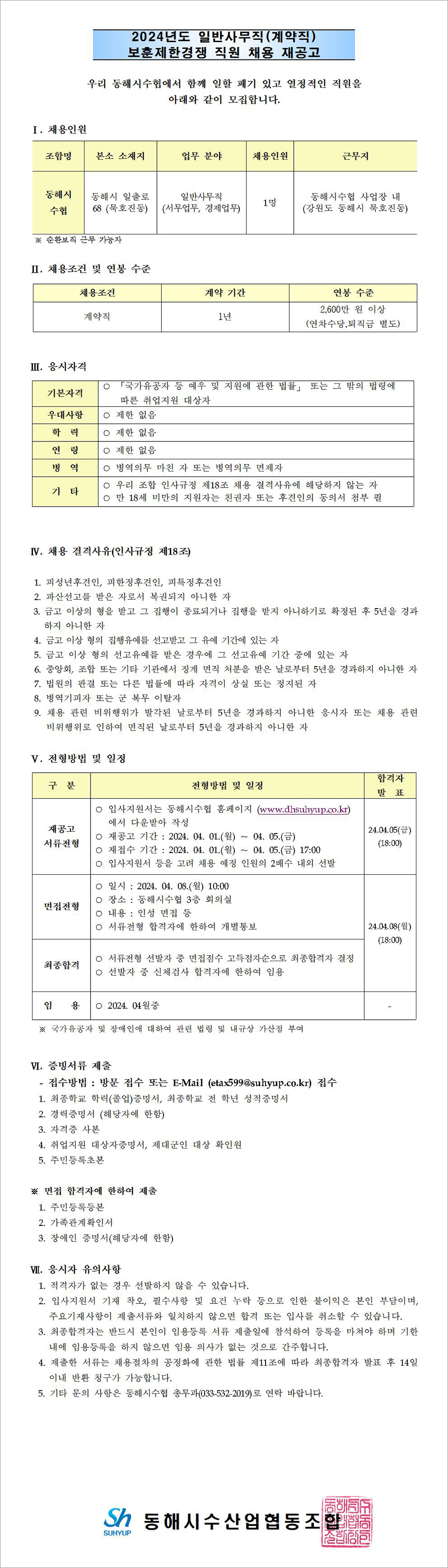 2024³âµµ ÀϹݻ繫Á÷(°è¾àÁ÷) º¸ÈÆÁ¦ÇѰæÀï Á÷¿ø ä¿ë Àç°ø°í